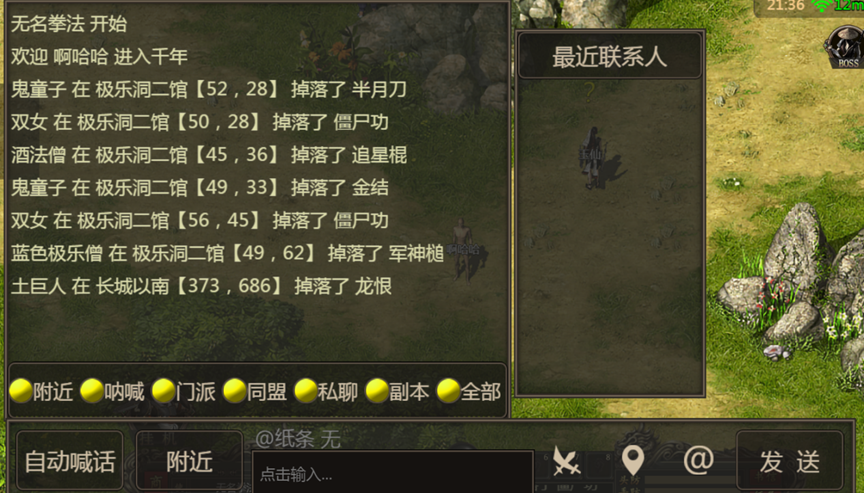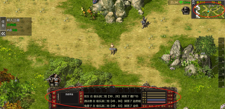 6、中下方有怪物掉落和聊天面板,点击可以查看掉落或与同一服务器的玩家聊天交流,聊天框上面会显示可操作提示内容。