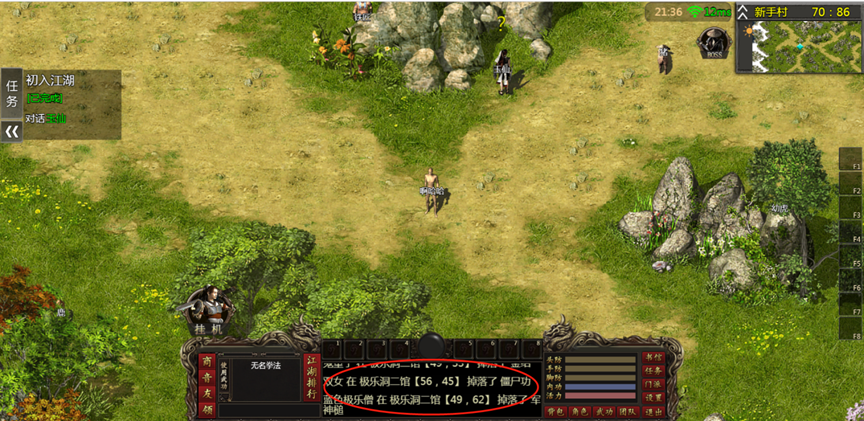 5、界面下方为各种系统功能,以及角色血量、能量、三防,右侧为安放武功的快捷键。右上放为地图